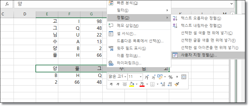 정렬하려는 행을 선택하고 우클릭 - 정렬 - 사용자 지정 정렬을 합니다. 정렬 메뉴는 위에도 있고 이렇게 우클릭 메뉴에도 있습니다.