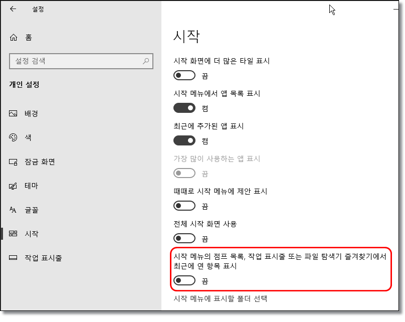 ▲ '설정'을 켜고 '개인 설정 - 시작 - 시작 메뉴의 점프 목록, 작업 표시줄 또는... 끔'