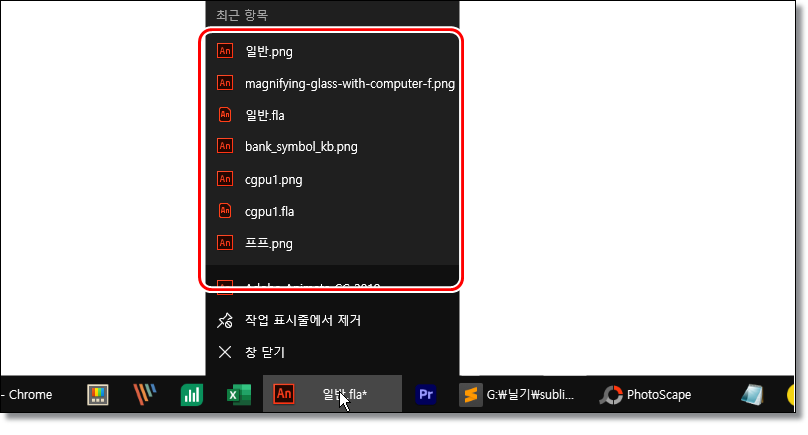 ▲ 작업 표시줄에 실행중인 프로그램을 우클릭하면 최근에 사용한 항목이 나온다. 삭제해보자.
