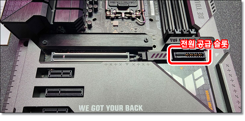 ▲ 그래픽카드 장착 슬롯 옆에 전원을 공급하는 슬롯이 생겼다.