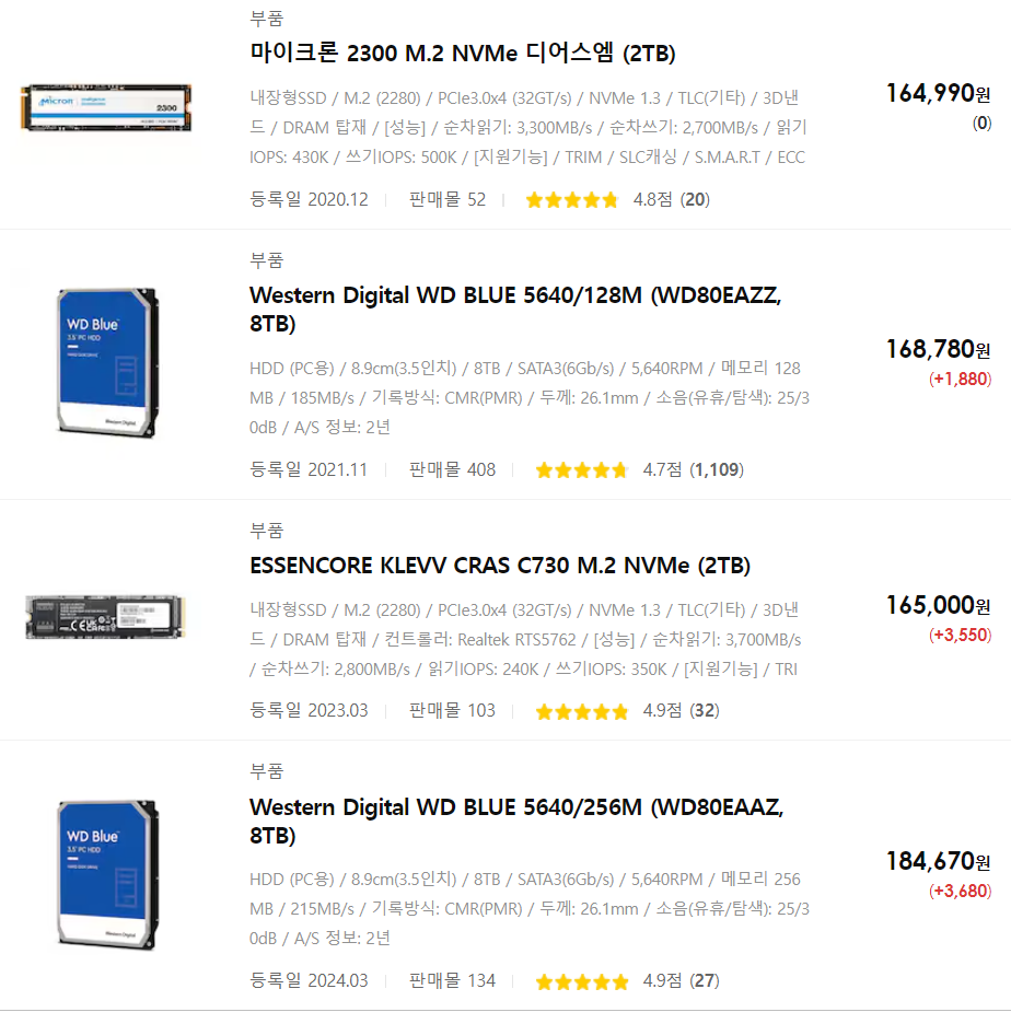 웬디 8테라 256 얼마 전에 16만원 했는데... 뭐임???