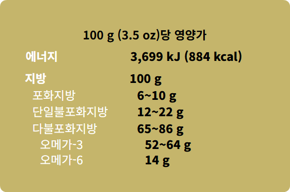 오메가-3 지방산 함량이 약 60% 정도 된다. 현대의학에서 강력하게 권장하는 건강식품이다.