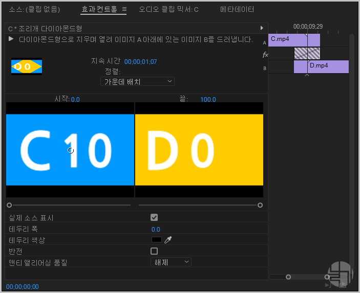 요즘 프리미어 프로 공부를 거의 안 하고 있어요. 웹코딩 배우고 싶어서 공부하고 있습니다. html 태그부터 하고 있는데 어렵네요. 어렵다는 건 지루함도 있죠. 잠시 벗어나 프리미어 프로 공부 좀 하다 넘어가야겠어요. 계속해서 비디오 전환 효과를 익혀보겠습니다. 오늘은 조리개 다이아몬드 형입니다. 제목에서 이미 예상됩니다.