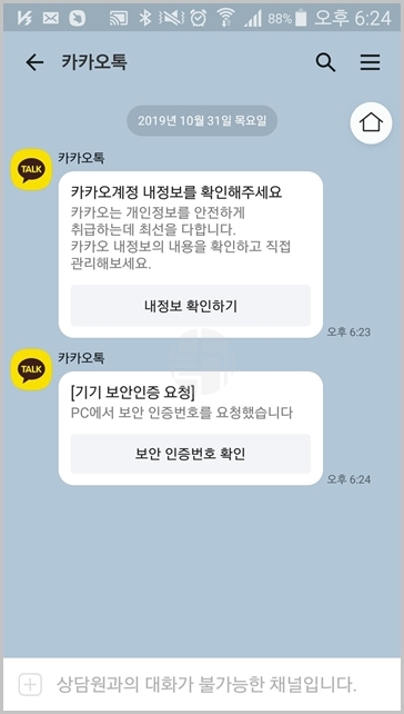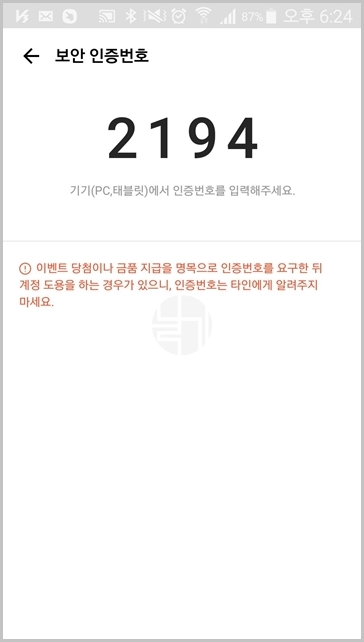 ▲ 폰 화면 : 보안 인증번호 확인을 눌러주세요.