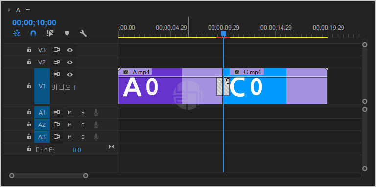 ▲ 적용하려는 클립과 클립사이에 드래그 드롭으로 적용. 복습중 사용한 비디오 클립은 눈에 잘 보이게 하기 위해 직접 만든 영상입니다.