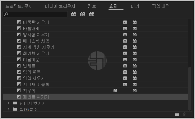 ▲ 효과 패널의 비디오 전환 효과 - 지우기 - 페인트 튀기기 효과 선택.