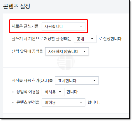 티스토리는 두가지 에디터를 쓸 수 있다. 블로그 관리 - 콘텐츠 - 설정에 들어간다.