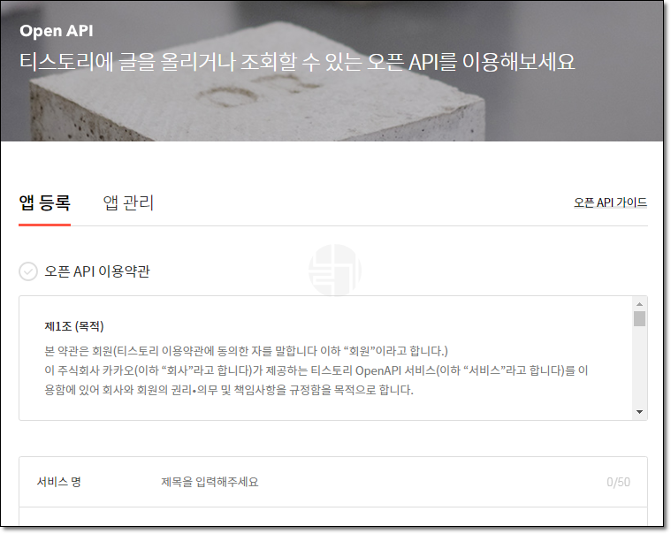 티스토리의 오픈 api 사용 신청을 하고.