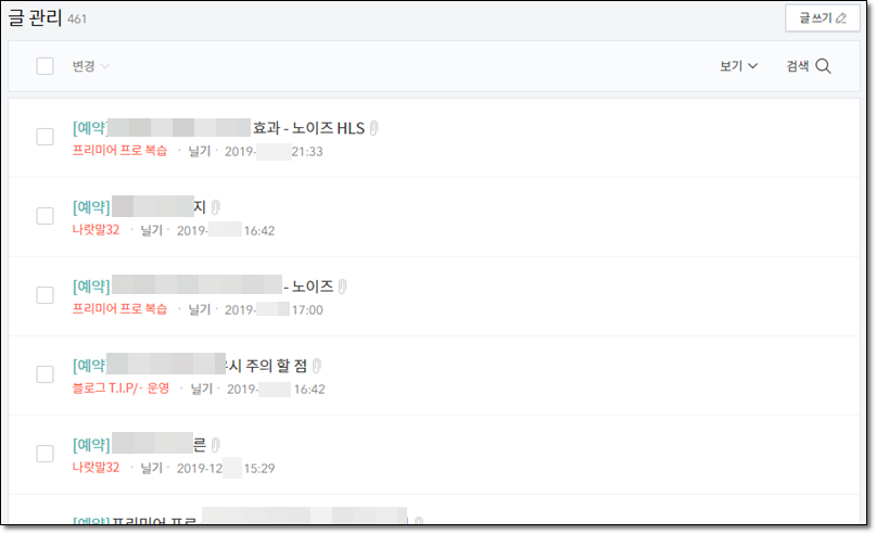 글 관리 옆에 글 수가 있습니다. 글 수는 발행한 글과 예약+비공개 글을 합한 숫자입니다. 저는 461개의 글을 쓰고 발행하고 비공개 중입니다. 예약글은 살짝 가린 건 이해해주시고요. 뭐 별거 없지만 미리 공개하면 흥미가 떨어지니깐요.^^