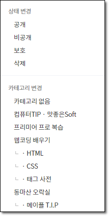글을 선택하고 카테고리를 누르면 선택한 카테고리로 글이 이동됩니다.