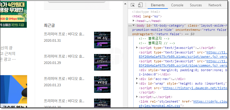 ▲ 클릭 후 마우스를 블로그에 이리저리 가져가면 파란색으로 구조를 알려줍니다. 마우스를 가져갈 때마다 오른쪽의 태그도 파란 부분의 태그 위치를 알려줍니다.