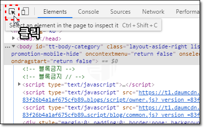 ▲ 브라우저에서 F12를 누르면 소스를 볼 수 있는 태그창이 켜집니다.
