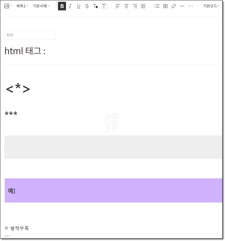 ▲ 저는 html 태그 공부할 때 이런 형태의 글을 썼습니다. 이 부분들이 반복되니 미리 만들어주면 편하게 사용할 수 있잖아요. 글 쓰는 시간을 단축해주니 공부에 시간을 더 쓸 수 있기도 하고요.