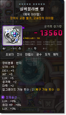 실버블라썸 링은 혼테일을 잡으면 얻을 수도 있고 옥션을 통했어 싸게 구입할 수 있습니다. 특히 일요일에는 많은 유저들이 1주일 동안 모은 보스 템들을 팔기 시작하면서 가격이 많이 내려가요. 지금은 70만 메소이지만 30만 메소까지 내려갑니다. 근데 70이나 30이나 ㅋㅋ