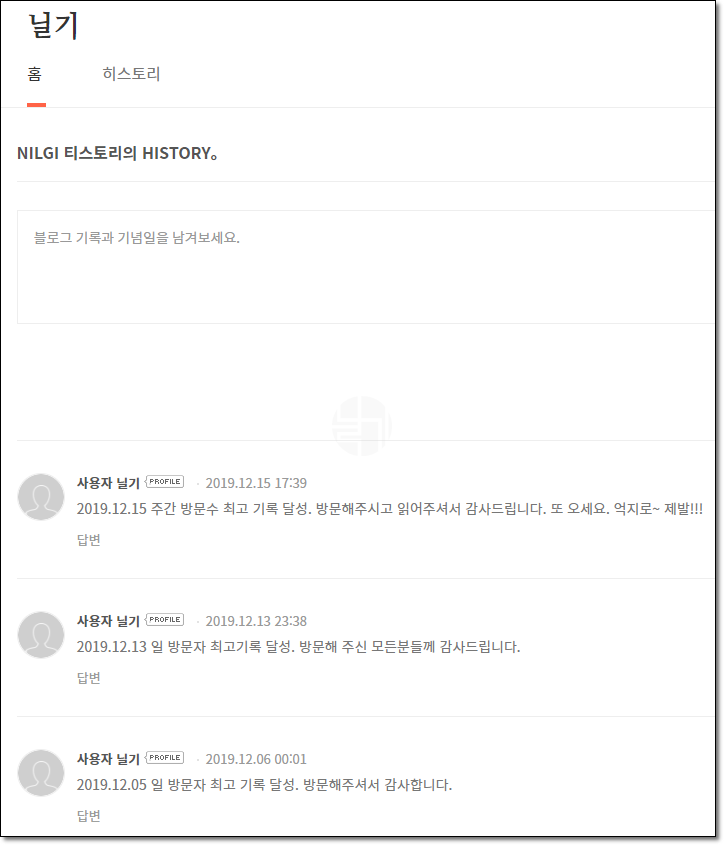 제 블로그의 방명록은 아무도 글을 쓰지 않습니다. 버려진 공간이죠. 그래서 활용하기로 했습니다. 네이버 블로그 시절이 기억나 방명록을 블로그 히스토리로 만들면 괜찮을 것 같더군요. 티스토리에서 네이버 블로그 얘길 하니 괜히 티스토리에 미안하네요.