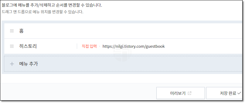 ▲ 저는 '히스토리'라 이름 주고 기존의 방명록 주소를 그대로 써줍니다.