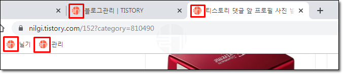 ▲ 그리고 파비콘은 여기에도 적용 됩니다. 브라우저에서 사이트 이름 앞의 아이콘으로 사용되고 북마크 아이콘으로도 쓰입니다. 그러니 블로기 관리에서 파비콘을 등록하며 좋겠지요.