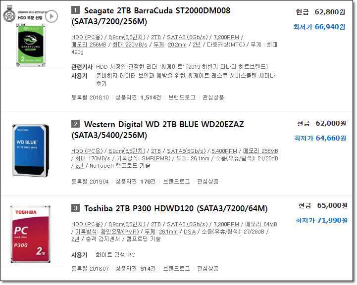 하드디스크를 추가 해야 할 것 같은데 2T냐 4T냐 고민... 씨게이트는 안 좋은 추억이 있어 꺼지시고. WD는 한번도 안 써봐서 써보고 싶네. HDD 그나물에 그밥이지. 2냐 4냐...흠... 블로그 쉴 때는 남아돌던 용량이 블로그 시작과 함께 슬슬 차기 시작한다. 좀만 더 고민 해보자. 컴퓨터 바꿔야 할 것 같아 부품을 하나씩 하나씩 보고 있다.