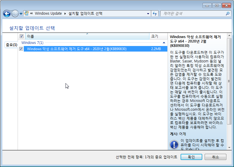 윈도우 7 서비스가 종료 되었다고 했는데 조금전에 업데이트를 받았다. 악성 소프트웨어 제거 도구 업데이트. 서비스 종료라는게 보안 업데이트만 종료하고 이런 기본적인건 계속 제공하나 보다. 윈도우 10으로 갈려고 했으나 조만간 본체를 바꿀 생각이라 그냥 7 쓰기로 했다.