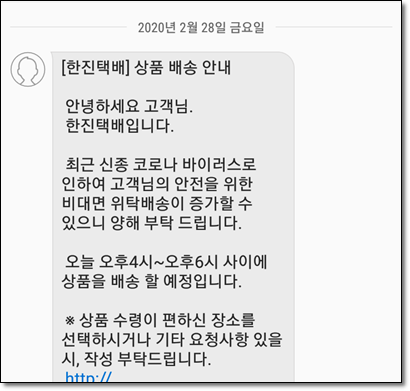 택배를 받았다. 아저씨 얼굴도 못 보고 택배를 받았다. 코로나 때문에 비대면 배송을 한다고 문자를 보내셨다. 씁쓸...
