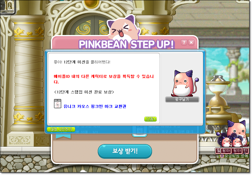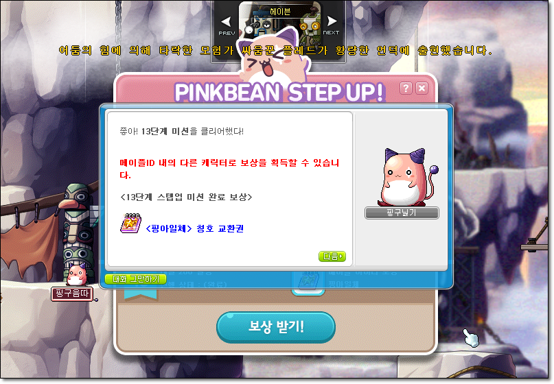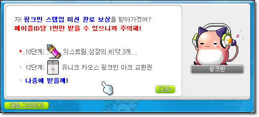 핑크빈 육성으로 받는 아이템중 일부는 일반 월드의 캐릭으로만 받을 수 있어욤. 그중 가장 아까운건 익스트림 성장의 비약인데 저는 전직업 200을 달성해서 버려야 했으요. 아깝아깝. 운 좋으면 몇십업을 한방에 할 수 있는 약이랍니다.