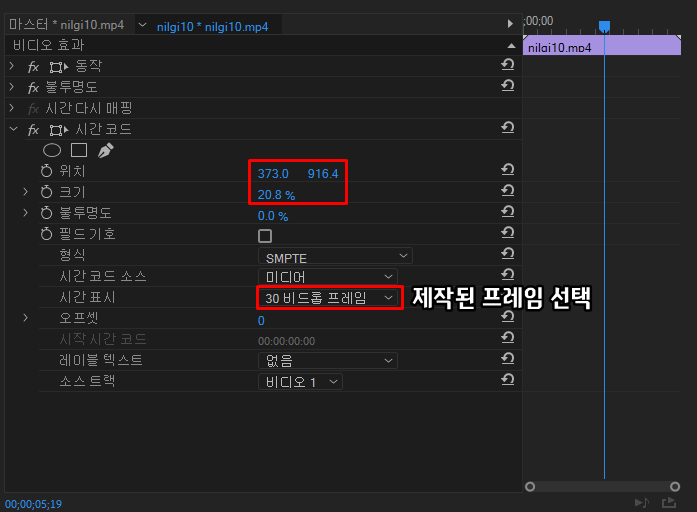 요리조리 움직여 보니 딱히 주의할 건 없고 시간표시의 프레임 선택을 영상을 찍은 프레임으로 선택해줘야한다.